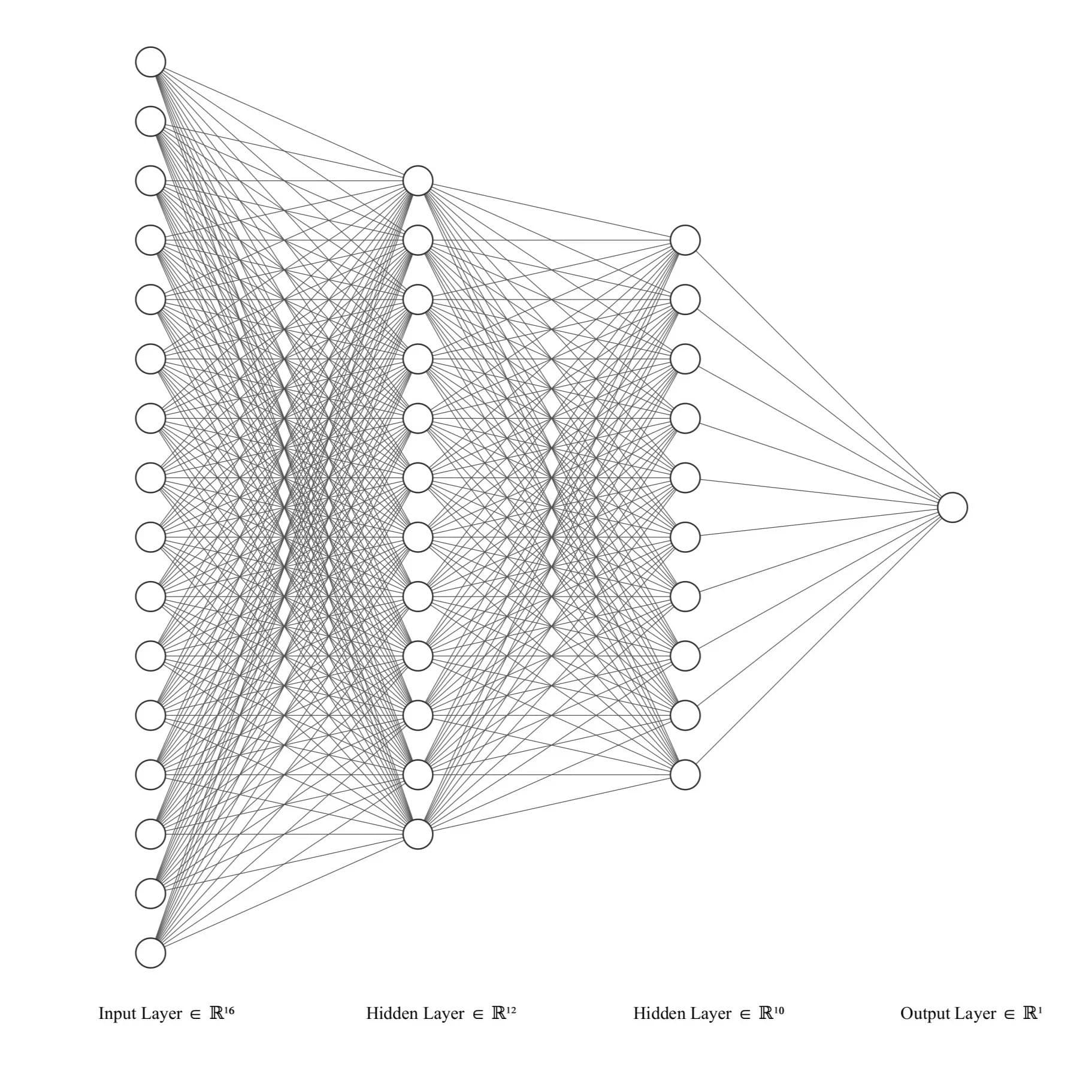 One level below that, we can say that it describes a function that takes in an array of 4 numbers on the left (the 4 empty circles), expands those into 12 numbers, reduces those to 10 numbers and finally outputs an array of 2 numbers on the right. We can see these are labeled “input layer”, “hidden layer” and “output layer” in the diagram.